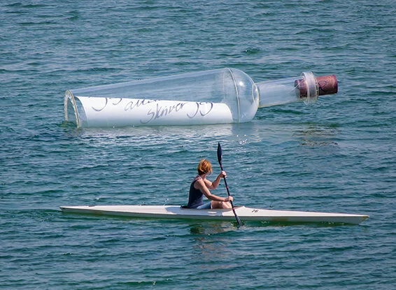 Som symbol på langsomheden, det uforudsigelige, upræcise og eventyrlige vuggede en kæmpe flaskepost i havet bølger med den eksistentielle meddelelse: ’Jeg er, altså skriver jeg’. Som et SOS fra en tid for et øjeblik siden indgik den i den internationale udstilling, Sculpture by the Sea i 2013 i Århus.