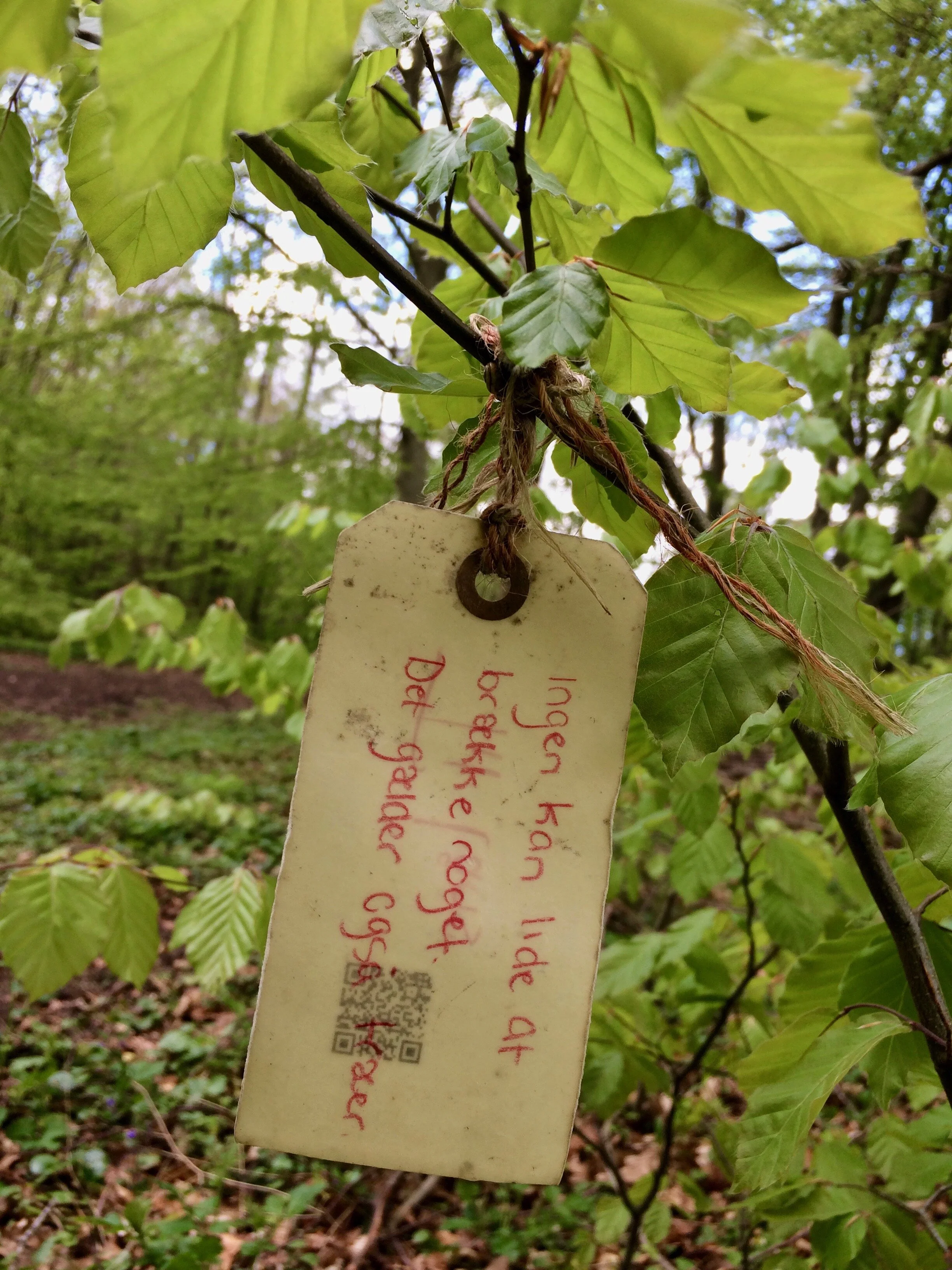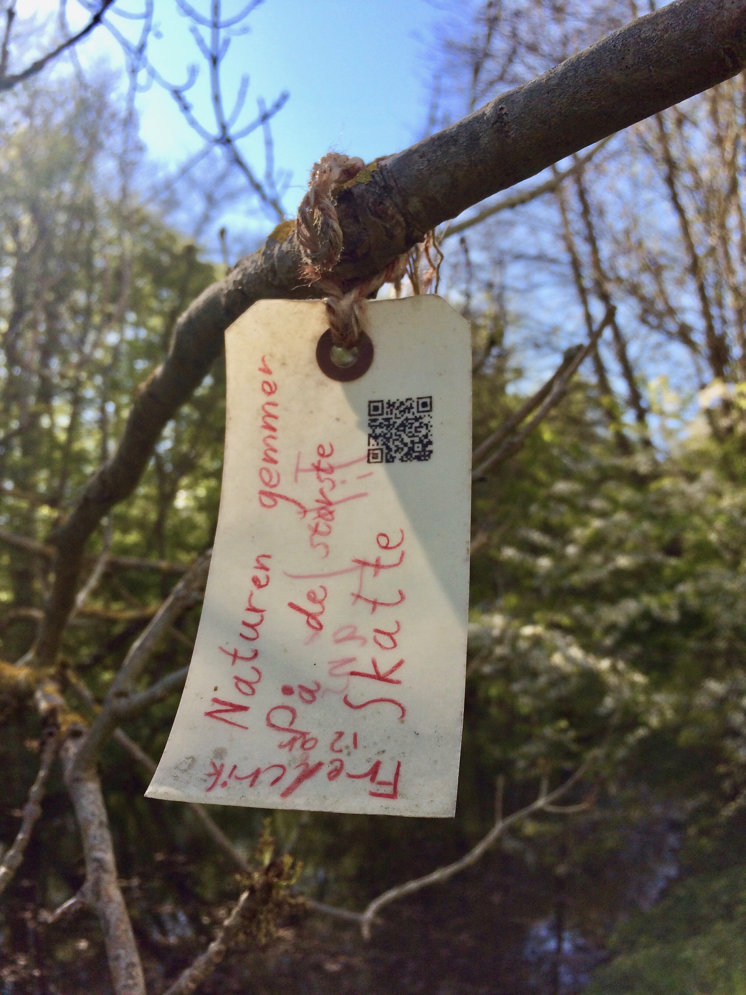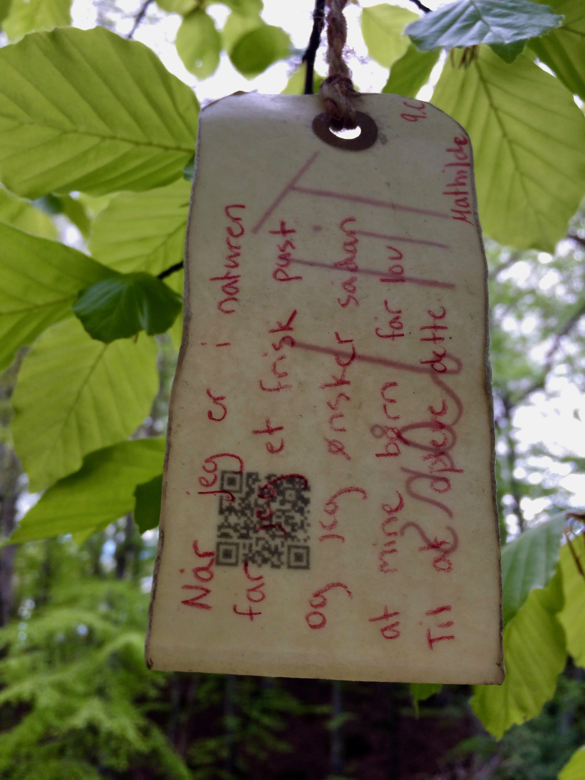 I august 2019 arbejdede jeg sammen med en 6. og en 9.klasse fra Odder om at skrive tanker, oplevelser eller drømme om naturen på den ene side af de små manilla-mærker og ‘Til låns’ på den anden side, stemple dem med QR-kode, ‘give dem regnfrakke på’ og lægge dem ud på deres forundringssted i området ved den gamle Stampmøllen i Odder. En livsbekræftende oplevelse i samarbejde med eleverne og deres lærere i et fint samarbejde med Ib Salomon fra Naturfredningsforeningen. Her inviterede sedlerne ind til efterfølgende workshop ved Naturens dag.