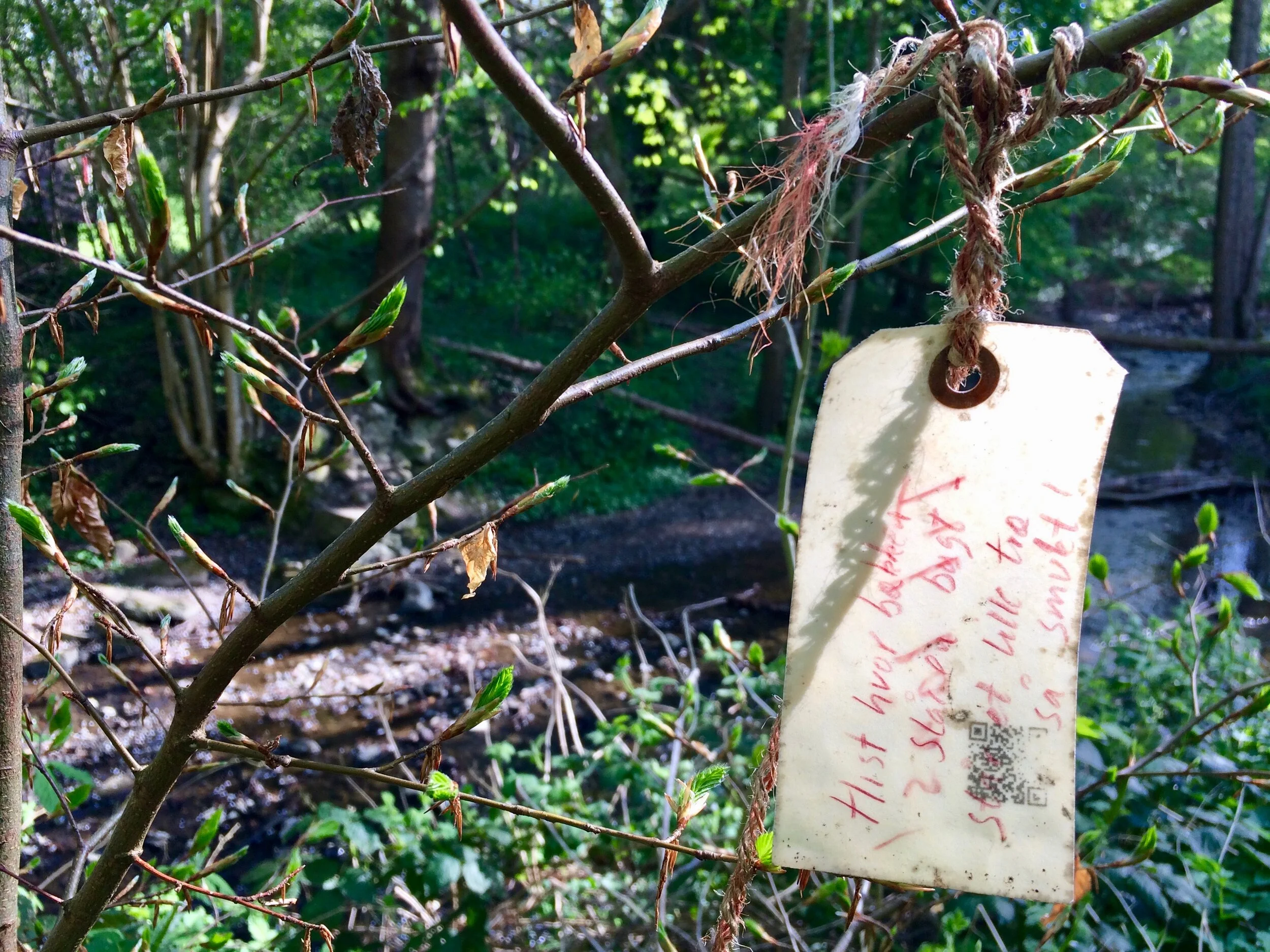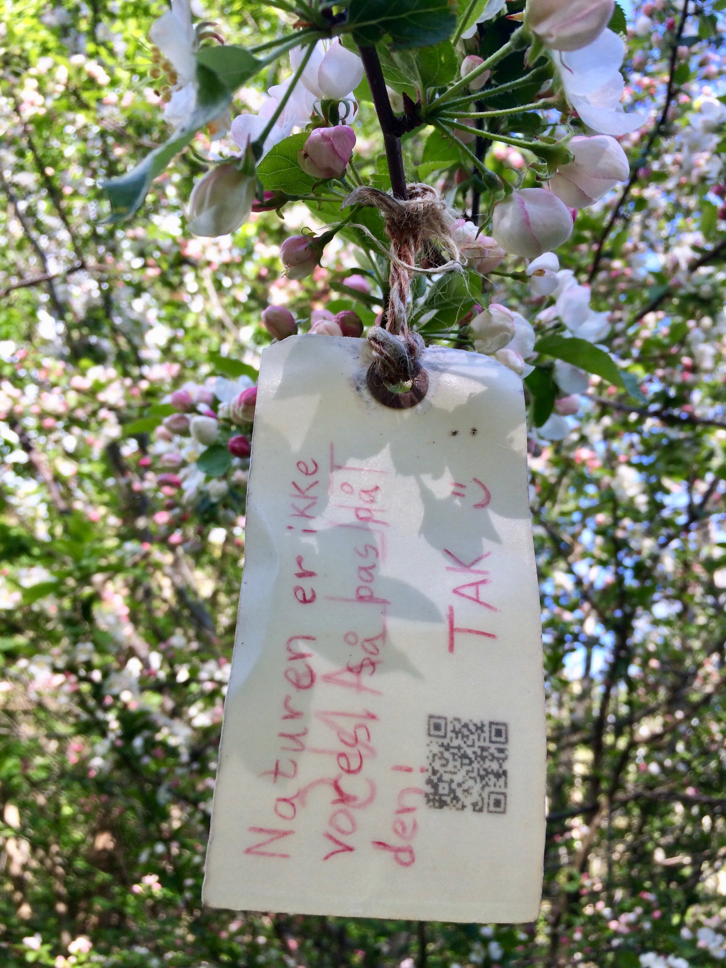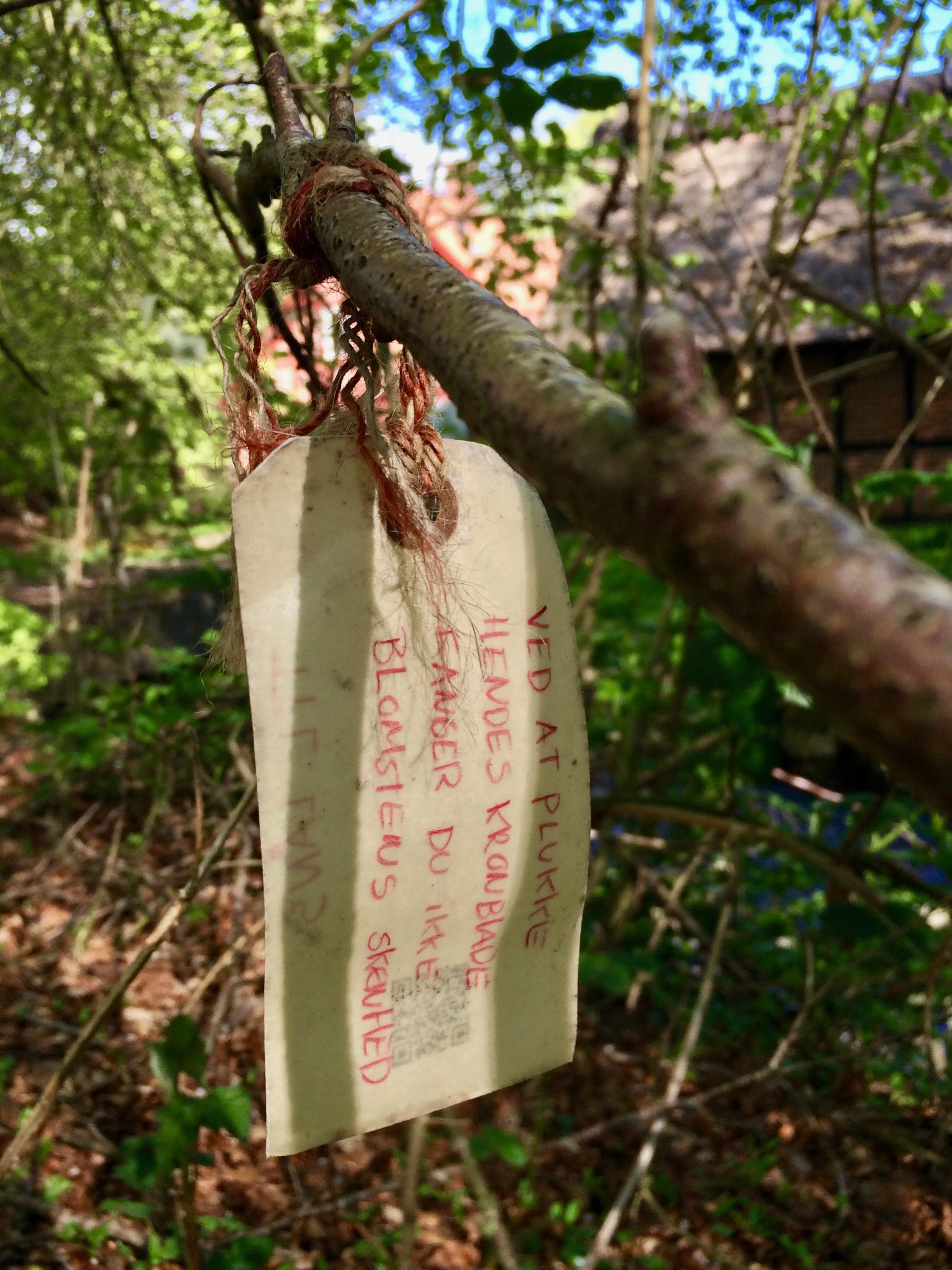 I august 2019 arbejdede jeg sammen med en 6. og en 9.klasse fra Odder om at skrive tanker, oplevelser eller drømme om naturen på den ene side af de små manilla-mærker og ‘Til låns’ på den anden side, stemple dem med QR-kode, ‘give dem regnfrakke på’ og lægge dem ud på deres forundringssted i området ved den gamle Stampmøllen i Odder. En livsbekræftende oplevelse i samarbejde med eleverne og deres lærere i et fint samarbejde med Ib Salomon fra Naturfredningsforeningen. Her inviterede sedlerne ind til efterfølgende workshop ved Naturens dag.